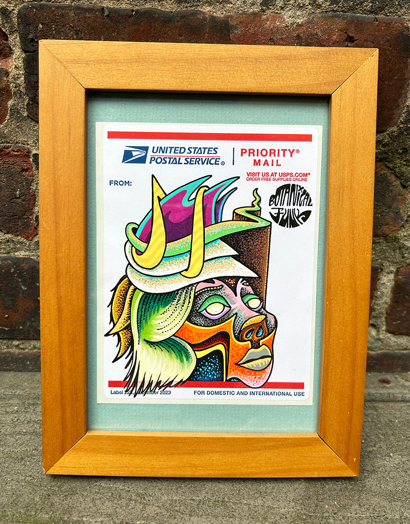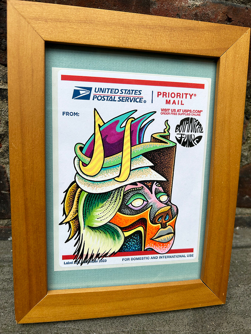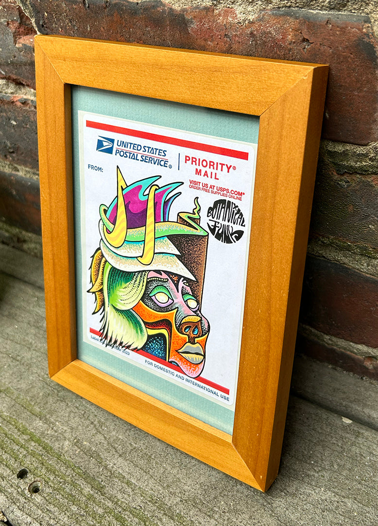 Drawn on a Priority Mail post office sticker (Label 228, 12/2023) with a sky blue matte and 1 inch thick wooden frame.