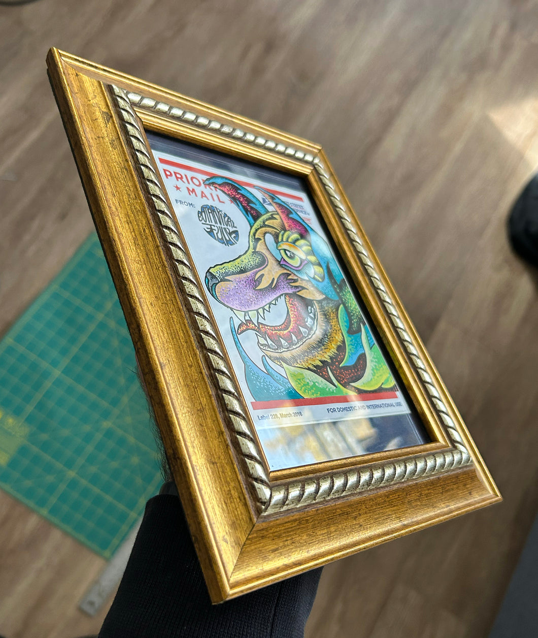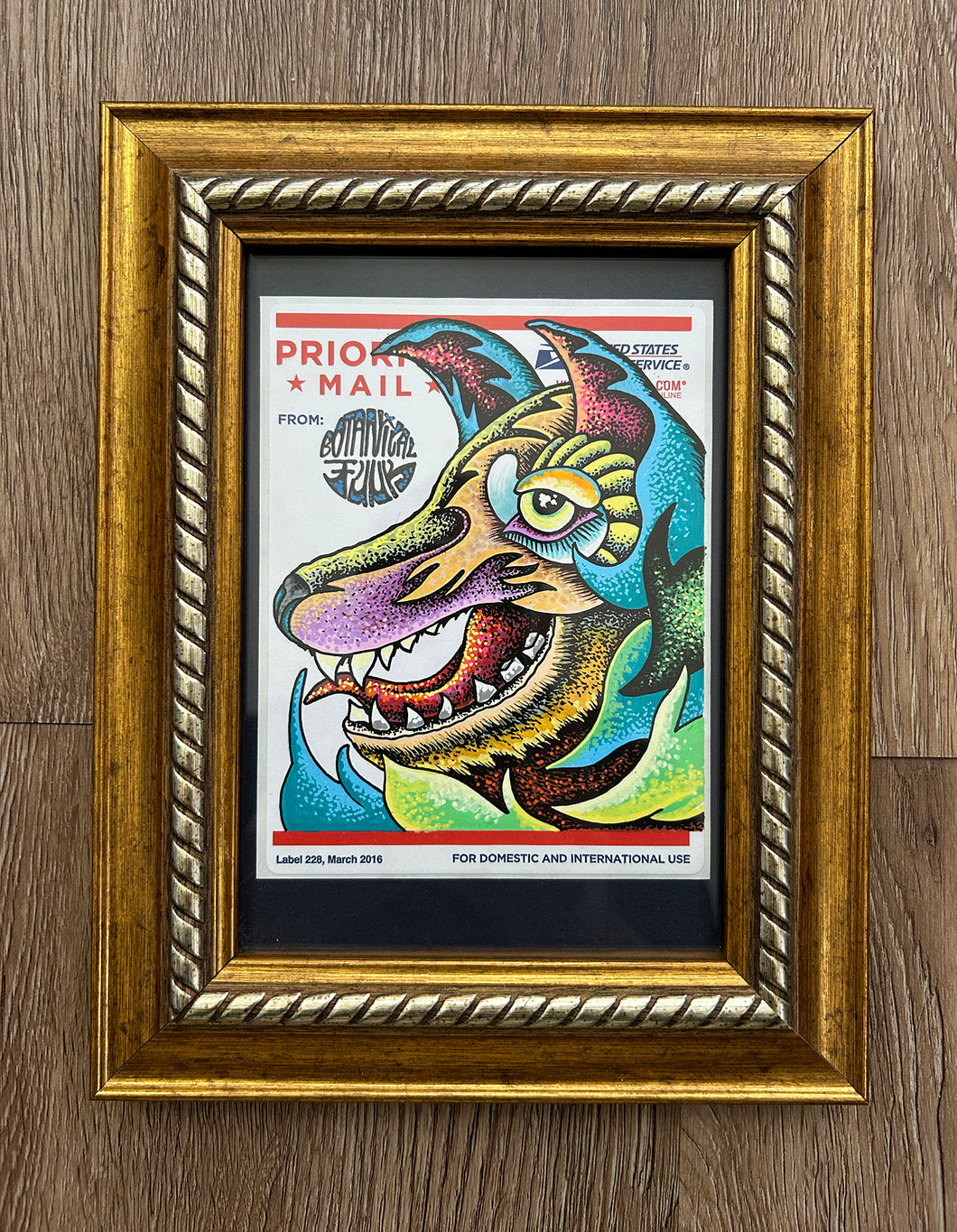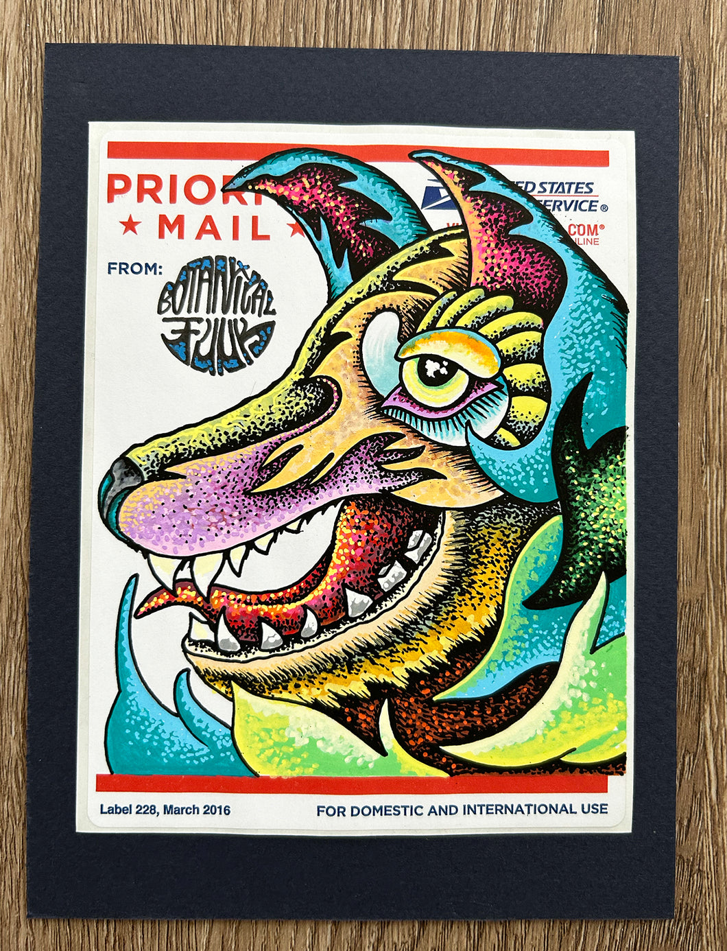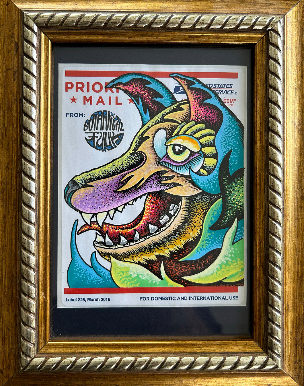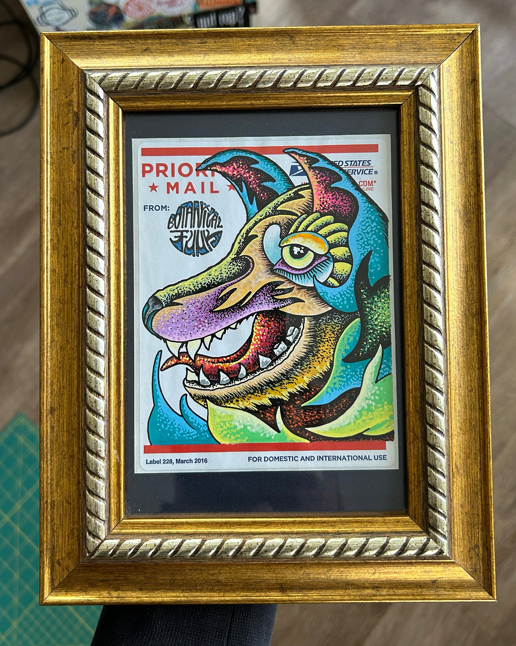 Drawn on a Priority Mail post office sticker (Label 228, 03/2016) with a navy blue matte & 1/2in. thick, gold frame